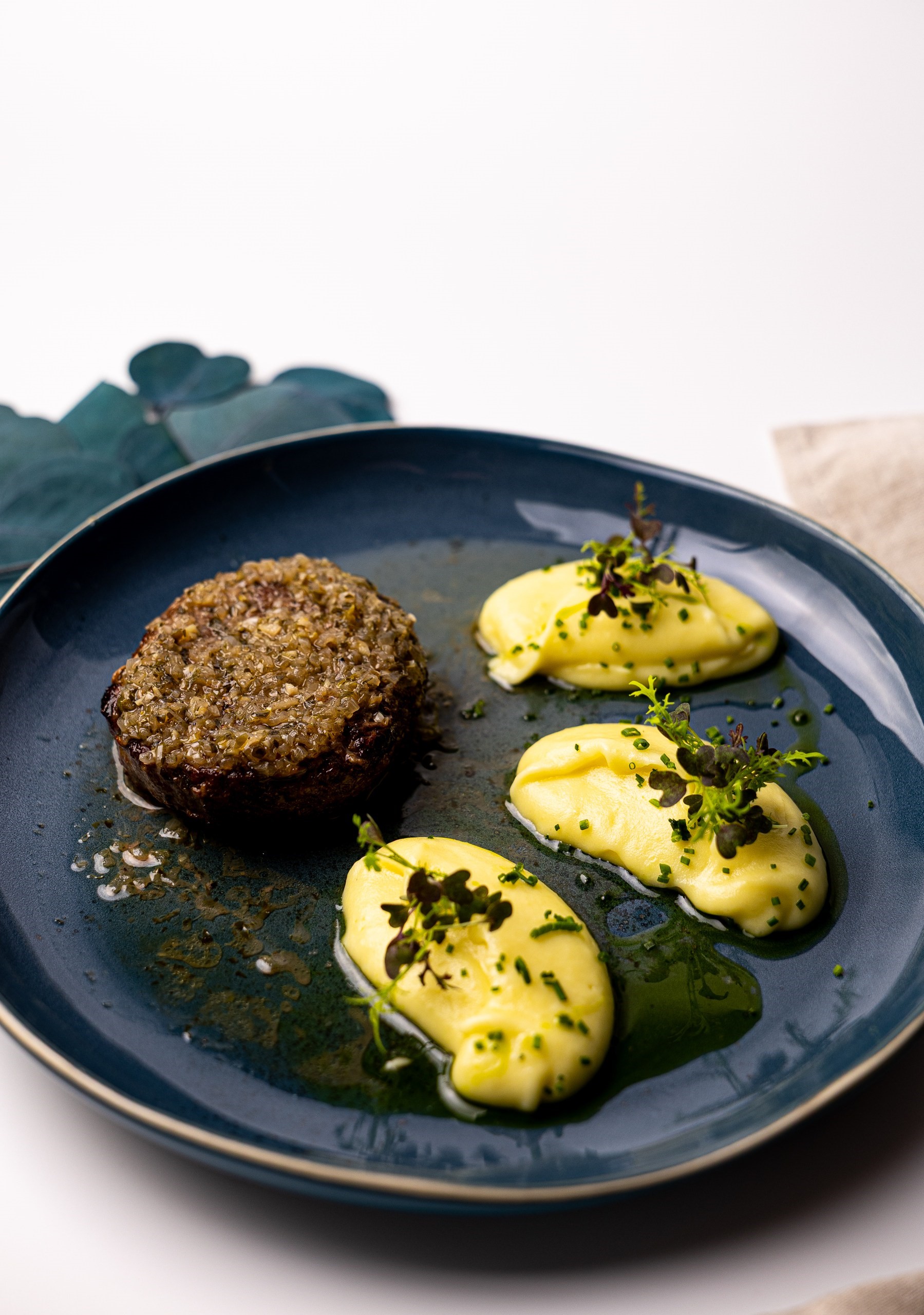 кафрский лайм, пюре из цветной капусты, икра тобико, чернила каракатицы